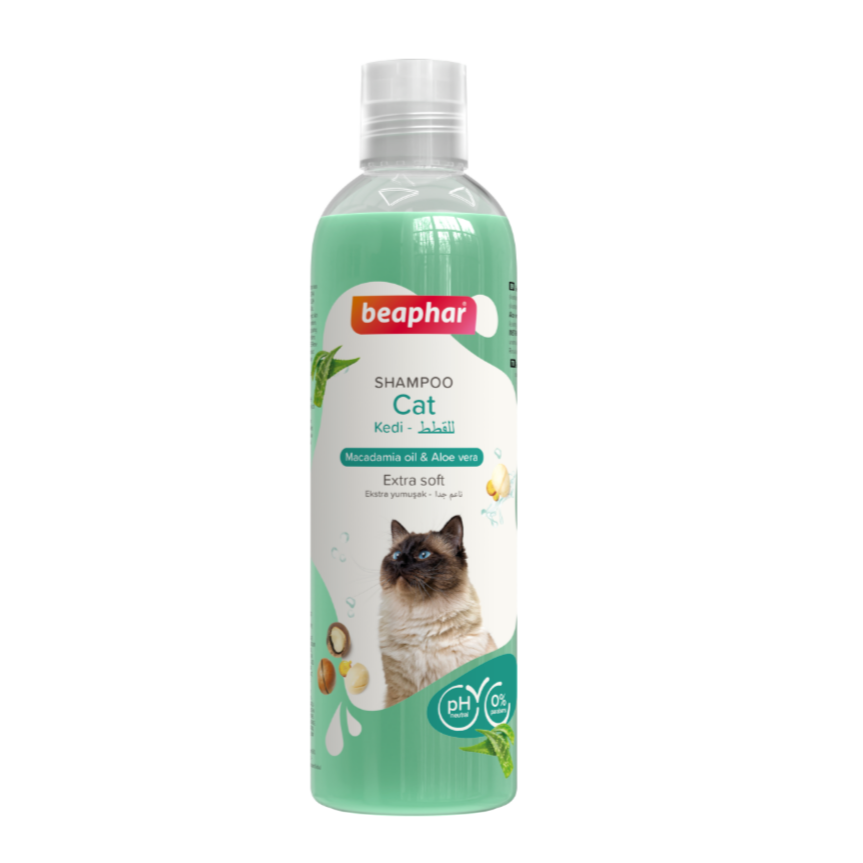 Beaphar Macadamia Oil & Aloe Vera Cat Shampoo is a mild, pH-neutral shampoo suitable for both short-haired and long-haired cats. Enriched with nourishing Macadamia oil and Aloe Vera, it gently cleanses while leaving the coat soft, shiny, and healthy, with a fresh and pleasant scent.