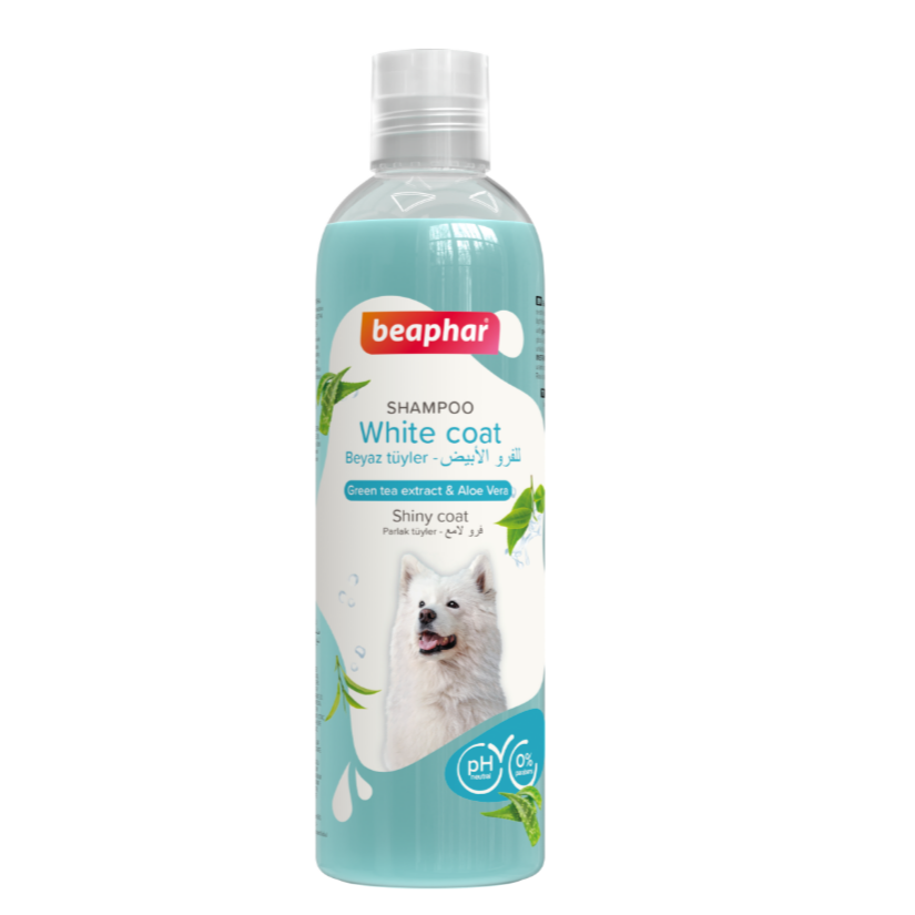 Beaphar Green Tea & Aloe Vera Shampoo for White Coated Dogs is a mild, pH-neutral shampoo specially formulated for dogs with white or light-colored coats. Enriched with green tea extract and Aloe Vera, it gently cleanses while leaving the coat soft, glossy, and maintaining its natural white color. It also leaves your dog smelling fresh and clean.