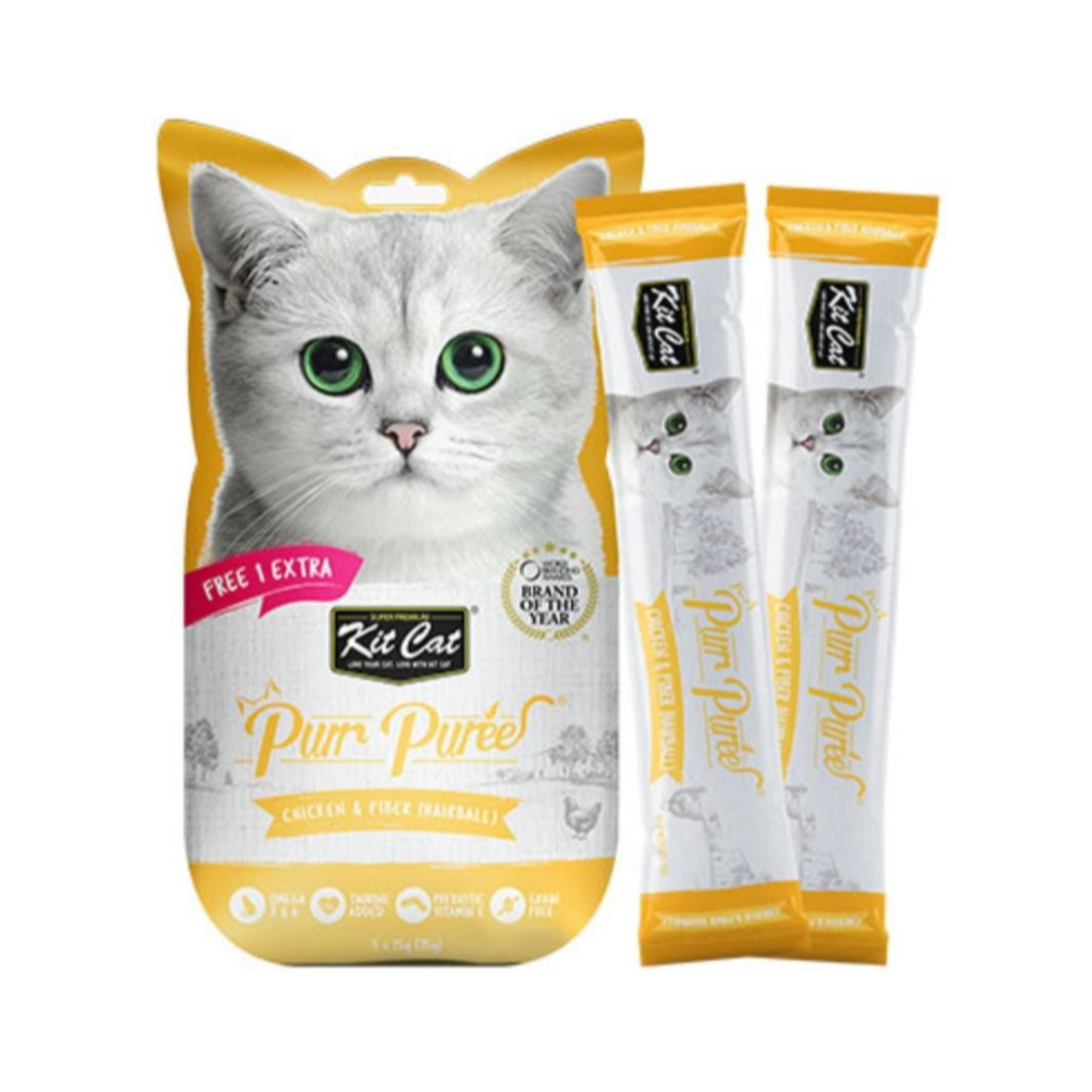Kit Cat Purr Puree Chicken & Fiber (Hairball) Cat Treats are smooth, creamy treats designed to help reduce hairball formation in cats. Combining high-quality chicken with dietary fibers, these treats support digestive health while providing a delicious and highly palatable snack. Each pack contains five 15 g portions for convenient feeding.