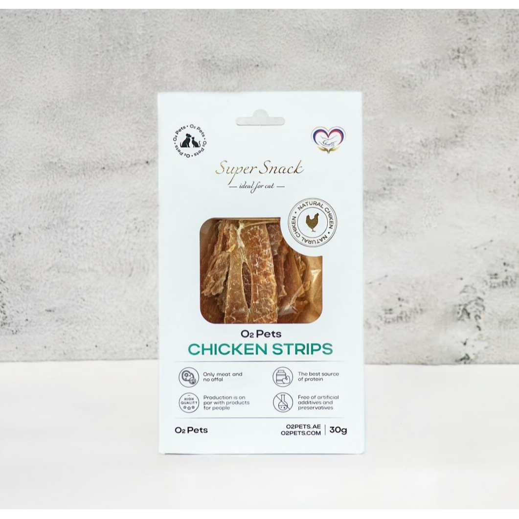 O2Pets Chicken Strips Treats are premium dog snacks made with 100% real chicken. These natural, protein-rich strips are free from artificial additives and preservatives, making them an excellent choice for training rewards or healthy daily treats.