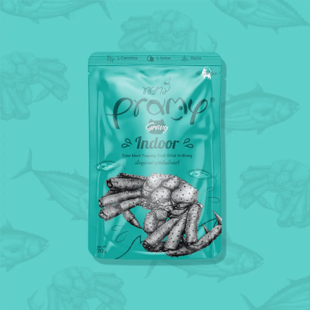 Pramy Indoor Tuna Meat with Crab Stick in Gravy (70g) is designed specifically for indoor cats, providing balanced nutrition tailored to their needs. Made with premium tuna and topped with crab stick in a delicious gravy, it offers essential proteins and omega-3 fatty acids that support a healthy coat and lean muscle. The formula is low in fat to help maintain a healthy weight, making it ideal for indoor cats who lead a less active lifestyle.