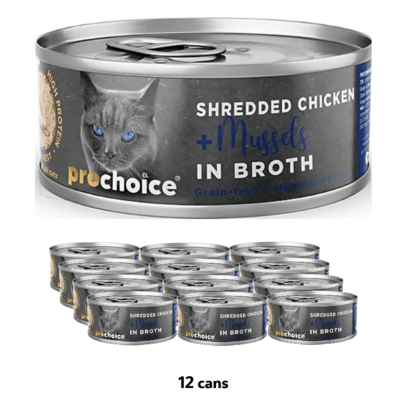 ProChoice Deluxe Shredded Chicken & Mussels in Broth Cat Wet Food – 12 Cans
